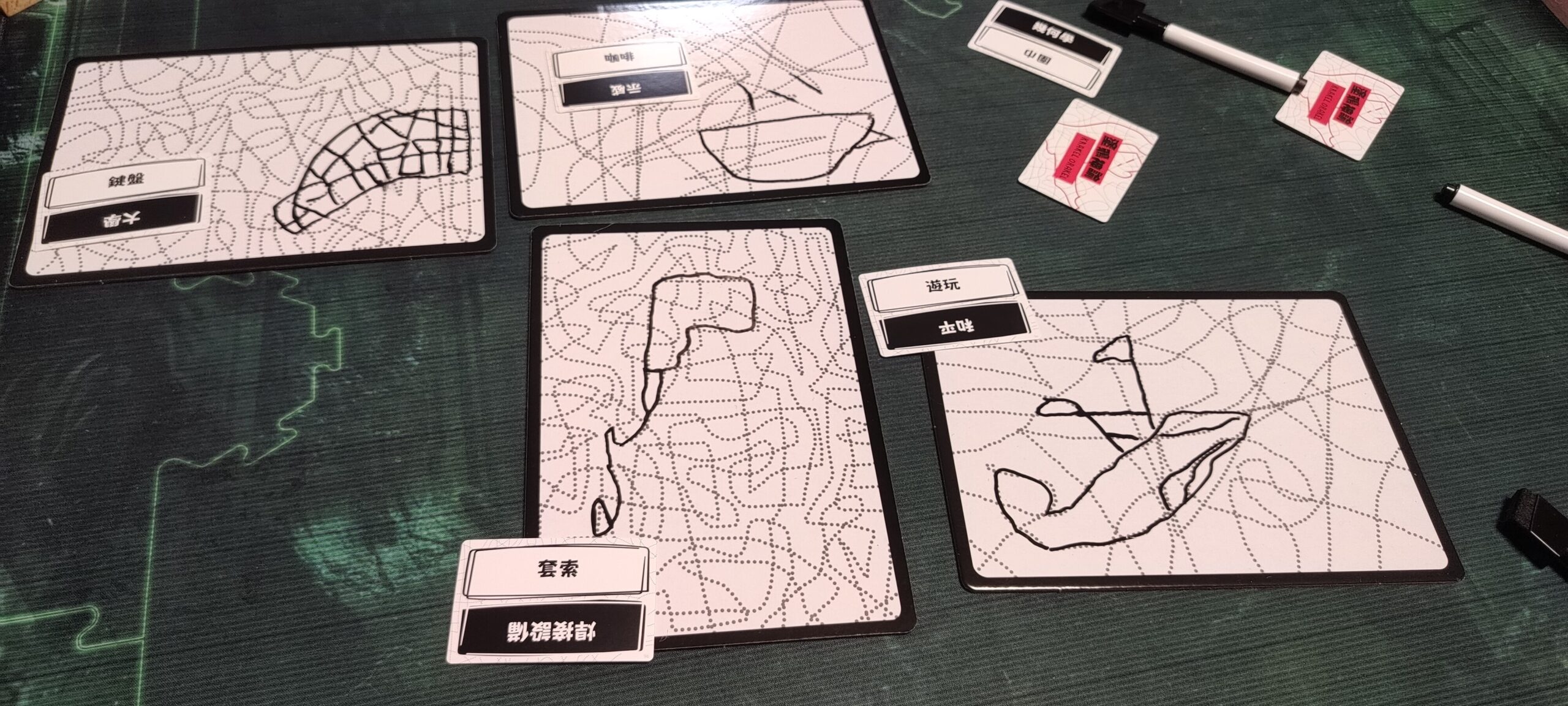 所以…這麼說吧,你不是在畫圖, 更像是在線條的組成中,找到你想表達的圖樣。2分鐘後,所有玩家把自己的畫畫放成正確的方向(畫筆放在下方),接著混入玩家人數的卡片,蓋著洗均後,正確答案+隨機牌會一起翻開。